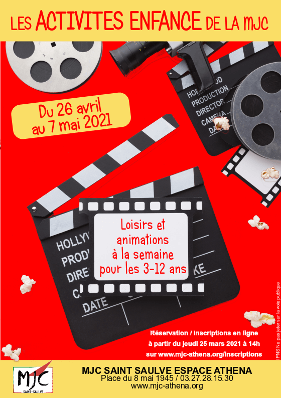 Les inscriptions pour les activités enfants 3-12 ans des vacances de Printemps 2021 de la MJC, du 26 avril au 7 mai, auront lieu uniquement par internet (hors règlement) à partir du jeudi 25 mars 2021 à 14h.