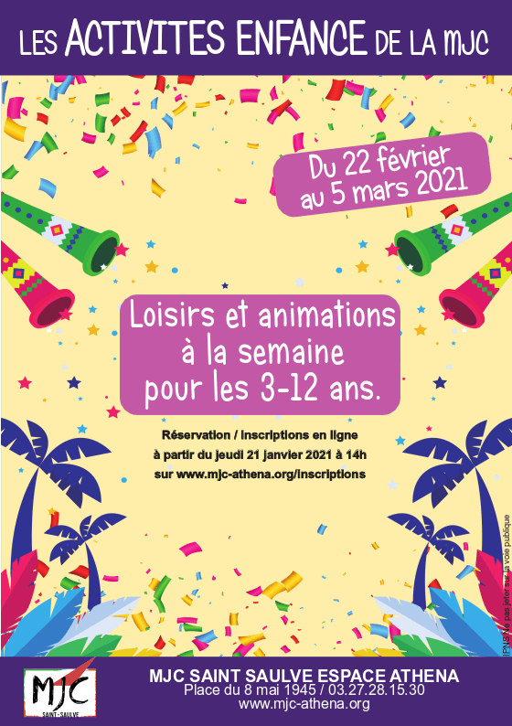 Les inscriptions pour les activités enfants 3-12 ans des vacances d’Hiver 2021 de la MJC, du 22 février au 5 mars, auront lieu uniquement par internet (hors règlement) à partir du jeudi 21 janvier 2021 à 14h. Vous pouvez dès maintenant consulter le flyer des vacances. A NOTER: en raison des contraintes sanitaires actuellement en […]