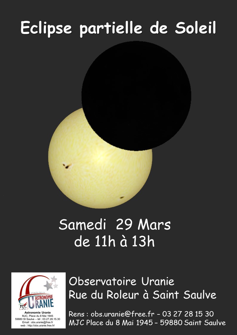 Une éclipse partielle d’Hélios (le soleil) aura lieu le 29 mars. À cette occasion, le club d’astronomie Uranie vous invite à l’Observatoire, rue du rôleur à Saint-Saulve. Plutôt rare et toujours spectaculaire, ne manquez pas ce spectacle qui se déroule en deuxième partie de matinée pour l’Europe et l’Afrique ! Pour en savoir un […]