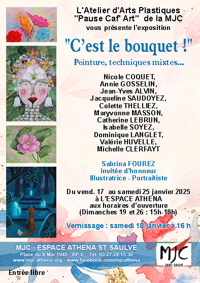 L’atelier pause Caf’Art de la MJC vous présente : L’exposition « C’est le bouquet! » Peinture, techniques mixtes… Avec Sabrina FOUREZ invitée d’honneur Illustratrice – Portraitiste Exposition du vend. 17 au samedi 25 janvier 2025 🎊Vernissage : samedi 18 janvier à 16 h 📅 Aux horaires d’ouverture (Dimanches 19 et 26 : 15h-18h) Les oeuvres présentées ont […]