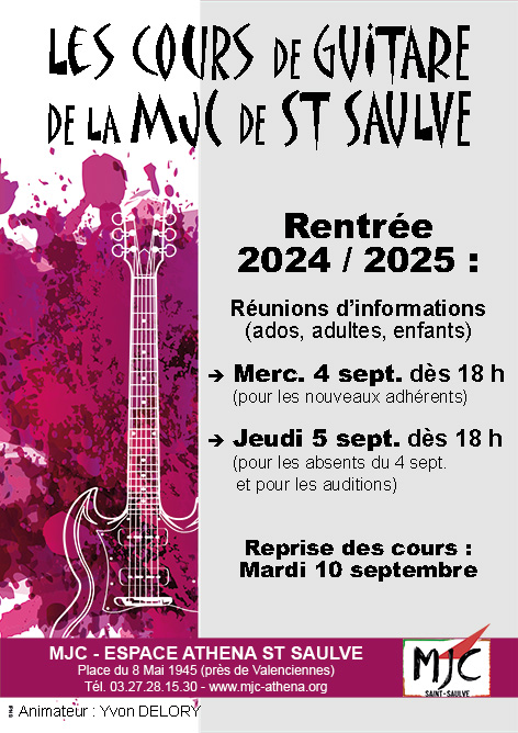 Rentrée 2025/2026 Réunions d’informations : Mercredi 3 Septembre à partir de 18h (fin 19h50) Jeudi 4 septembre à partir de 18h (pour les absents du 3 et pour les auditions) Reprise des cours le mardi 9 septembre 2025 Les cours de guitare proposés par la MJC de Saint-Saulve s’adressent à tous : du débutant au […]