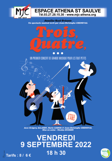 trumentiste, et deux musiciens : un guitariste trublion, et une violoniste et chanteuse lyrique aux atours de diva. A trois ils vont donner un concert de « grande » musique, en la revisitant au gré de leurs humeurs. Et ça ne sera pas triste ! Drôle et tendre, « Trois, quatre, … » est une porte d’entrée dans le monde des concerts parfois un peu trop sérieux de la « Grande » musique.
